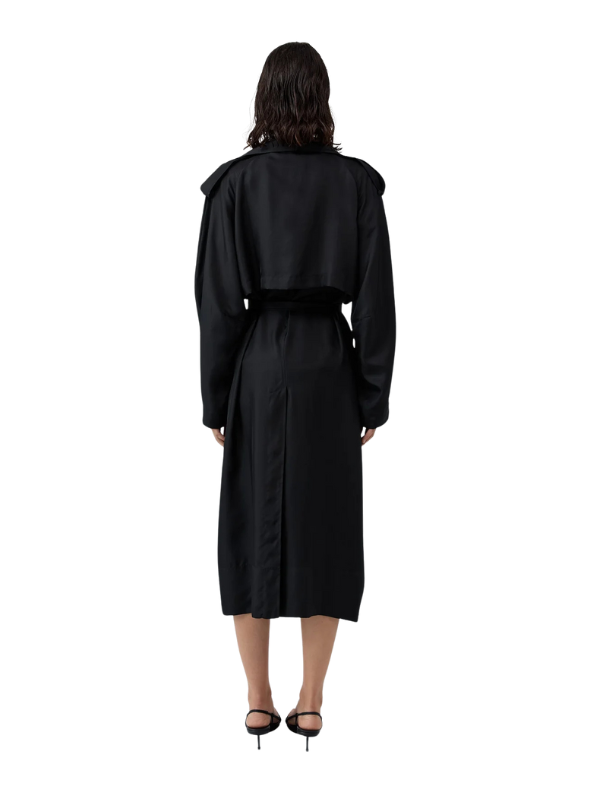 Back view of the Silk Twill Relaxed Trench in Black, displaying its midi length and softly structured silhouette.