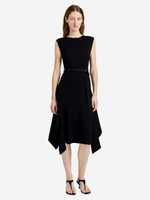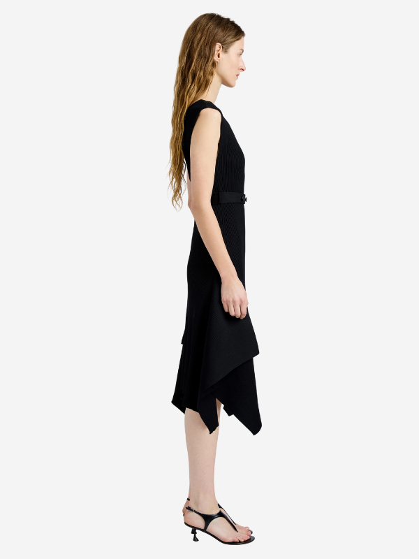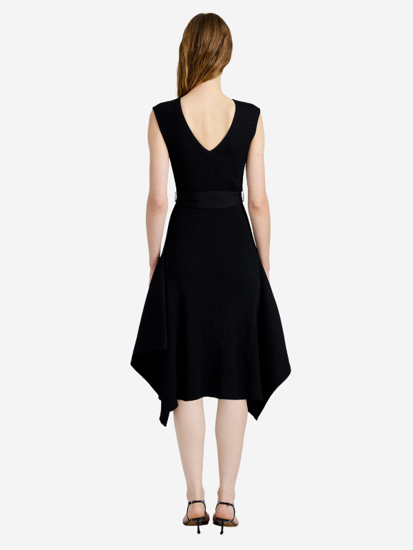 Artistic angle of the Artemis Dress in Black, emphasizing the flow of the handkerchief hem and the chic style by Proenza Schouler.