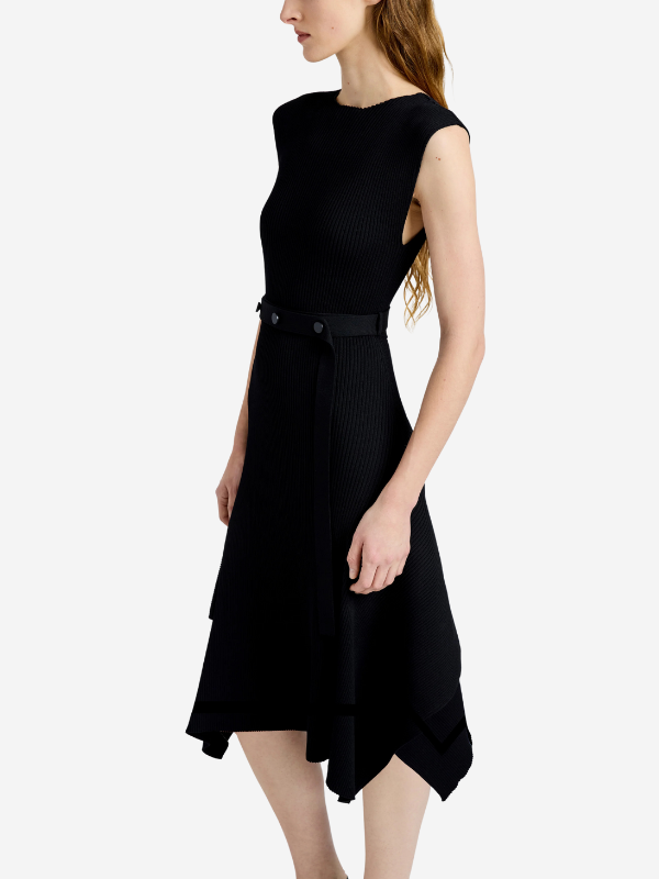 Close-up view of the Artemis Dress in Black, featuring the rib knit texture and self-tie detail by Proenza Schouler.