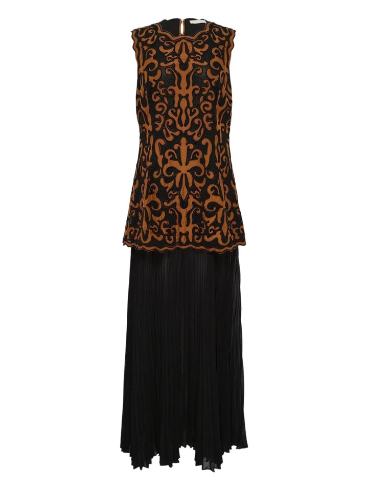 Debuting in Look 50 on the AW25 runway, Ulla Johnson's Auryn Dress is impeccably made from a Victorian-inspired embroidered appliqué, set against a delicate black mesh with intricate taffeta patchwork in rich saffron. This statement silhouette transforms into pleated habotai fabric at the skirt that also has a lustrous taffeta finish.