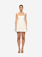 Close-up detail of the Rue Jacquard Mini Dress in White highlighting the structured mini-length skirt.