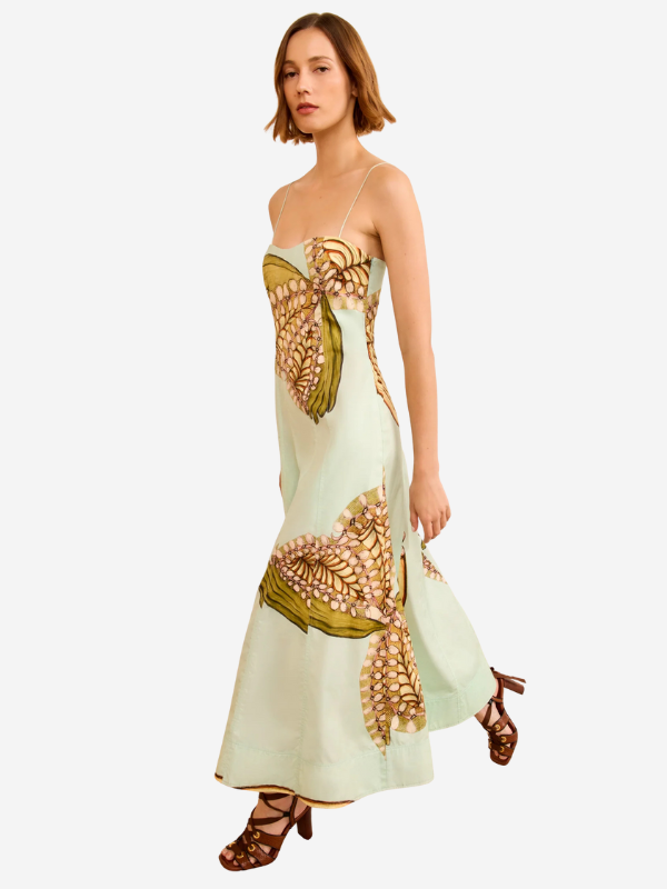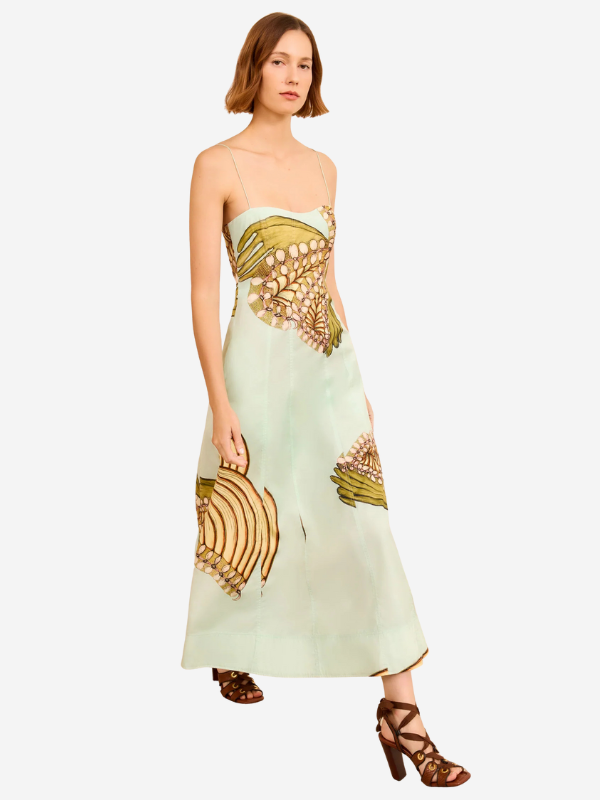 Vesela Cami Midi Dress in Water Blossoms by Ulla Johnson, showcasing vibrant floral prints and delicate straps.