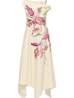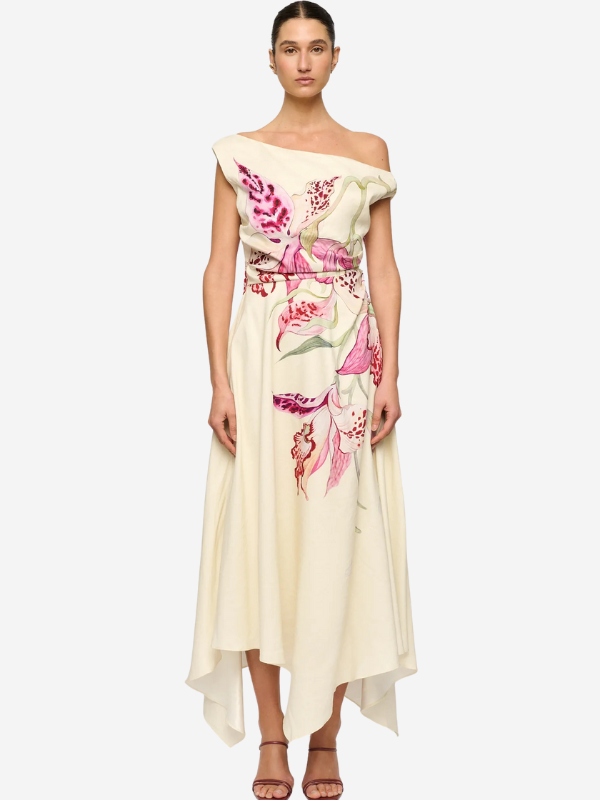 The Waverly Dress by CLEA is an asymmetric silhouette with a handkerchief hemline, cut in an exclusive Kuro Neko collaboration orchid print. Hand-illustrated and placed using an elevated printing technique, the artwork enhances the draped shoulder and softly tucked waist. Fully lined and finished with a precise hem and invisible side zip.