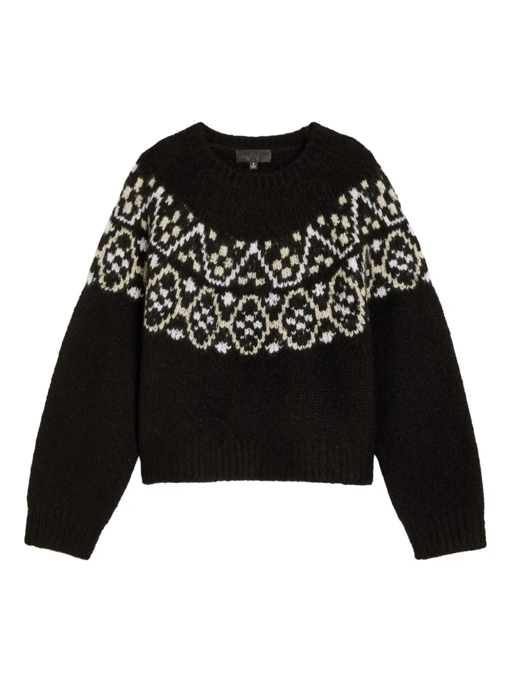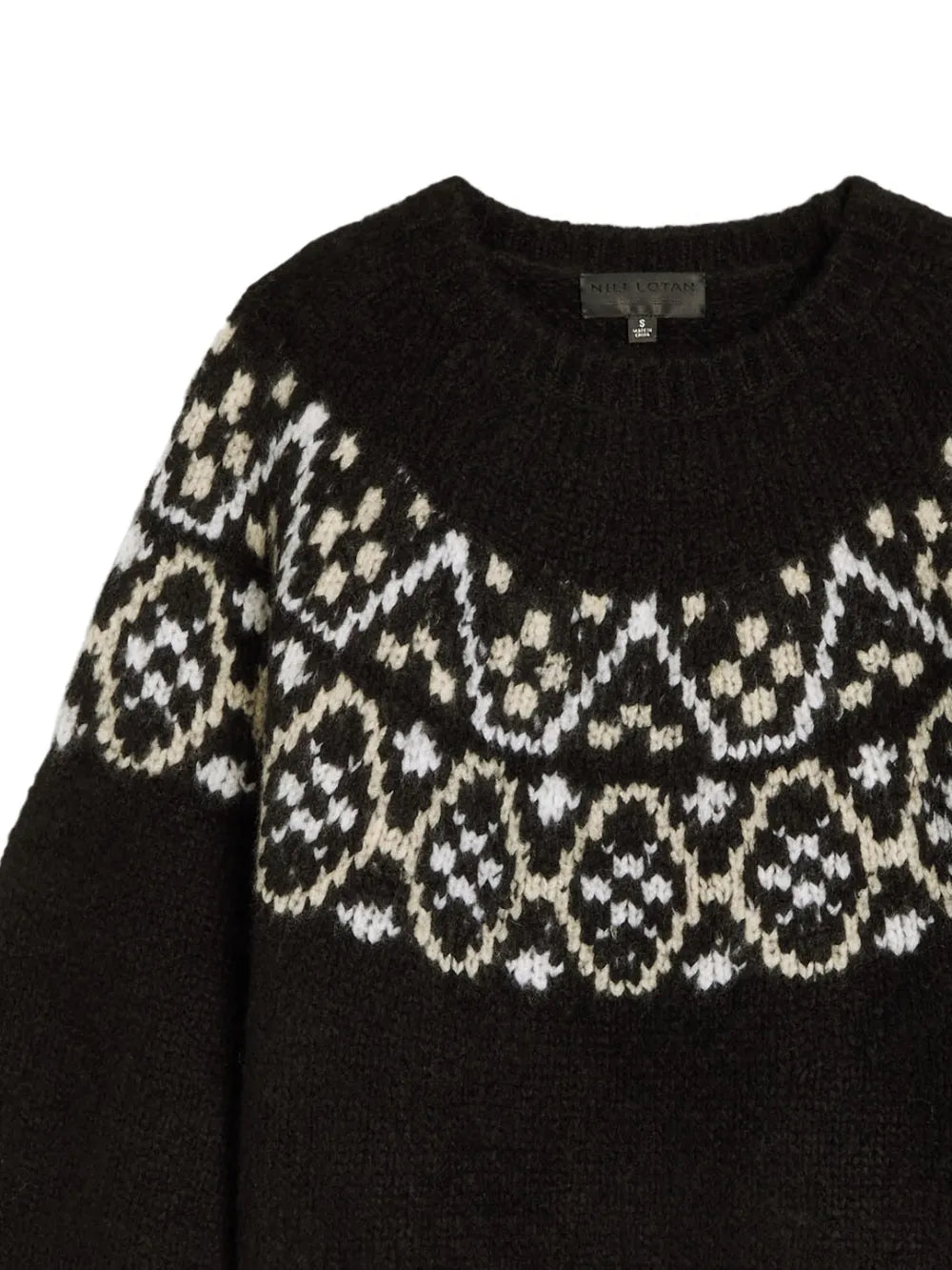 Nili Lotan's Chrissy is a crew neck, long sleeve, pullover sweater. Chunky jersey stitch with fairisle pattern across the chest. Relaxed boxy body, regular sleeve length, medium body length. 1x1 rib at hem, sleeve, and neckline.