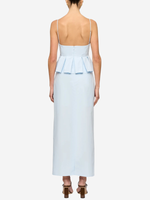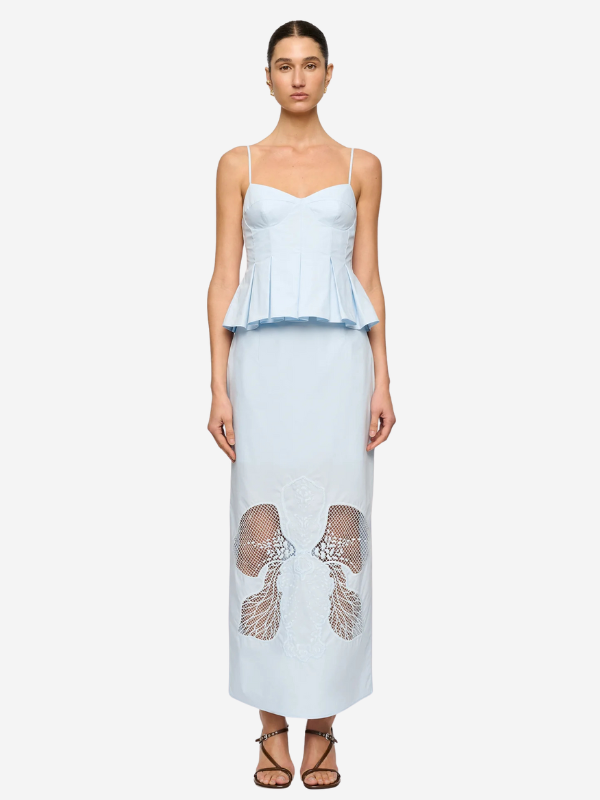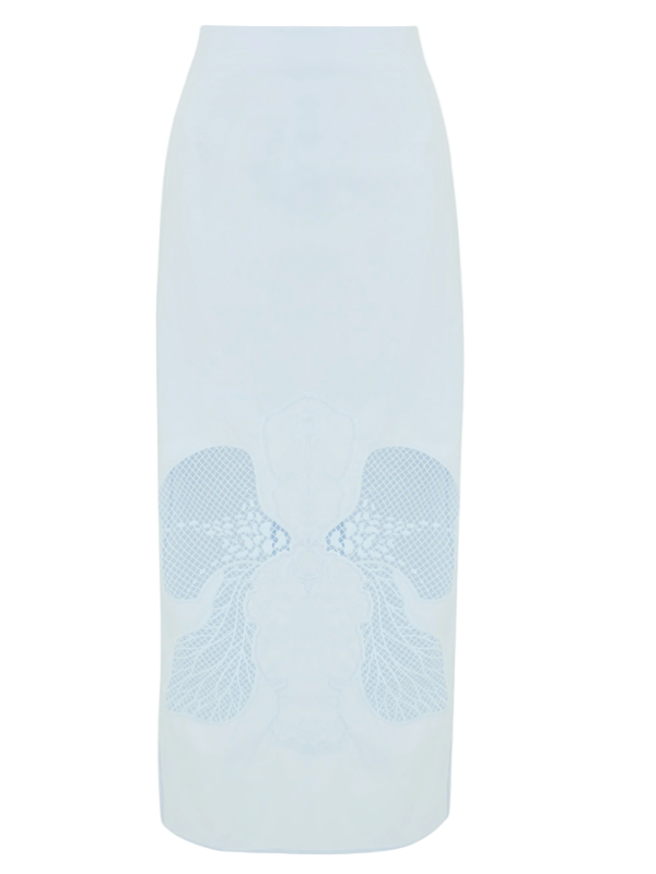 The Leonie Skirt by CLEA is a polished longline style in cotton, cut with a straight profile and deep back vent for movement. Finished with hand-drawn orchid embroidery by Creative Director Natasha, wrapping seamlessly around the hem with cutwork detail.