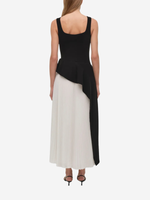 Simkhai's Zayla Midi Dress features a fitted, sleeveless bodice that flows into an asymmetric peplum and a pleated skirt in a mixed-media fabrication.