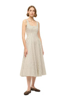 Staud's Wells Dress has a square neckline and features a corset-inspired paneled bodice to create a flattering, fitted shape through the waist. It is made out of a lightweight cotton poplin and has a center back zipper.