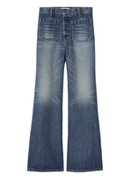 Nili Lotan's Florence Jean is a high-rise flare leg jean in Japanese non-stretch denim. Fitted through waist and hips. Front and back top stitched patch pockets. Button fly. Shank closure. Belt loops. Designed for a 34" inseam.