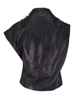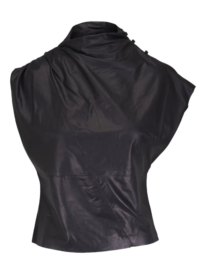 TWP's Wish You Would Top features a Mock neck, cap sleeved blouse draped in supple lamb leather finished on both sides. Loose fit, with a soft drape that skims the body. Complete with a placket trim on one shoulder and pleats on the other shoulder.