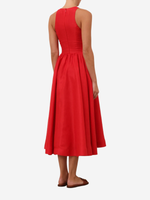 The Patience Midi Dress from Zimmermann's Resort Swim 2026 Collection. A linen midi dress featuring a round neckline, ruched bust with criss-cross strap detailing, finished with a self-tie waist belt and heavily pleated skirt.