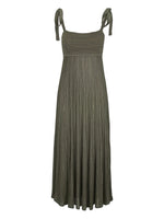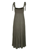 Side view of the Wanderlust Metallic Maxi Dress in Metallic Olive, emphasizing the styling of the pleated design and self-tie straps.