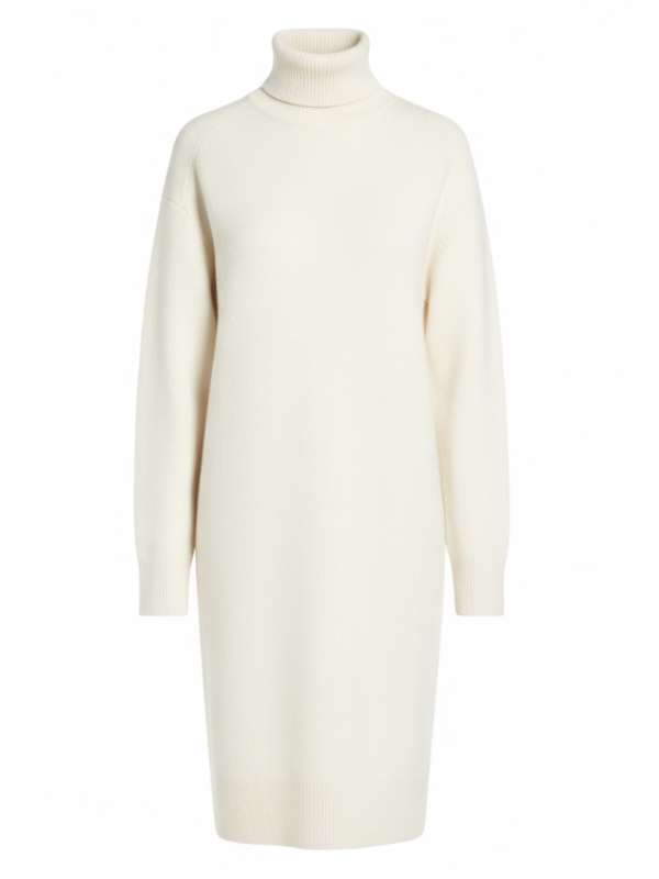 Top-down view of the Broad Turtleneck Dress in Milk laid flat, emphasizing its chunky turtleneck and warm colors.