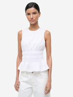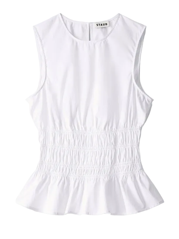Model wearing the Staud Culver Top in White, showcasing its elegant design with waist ruching for a flattering look.