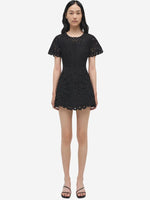 The Emrys Mini Dress by Simkhai features a short-sleeve fitted bodice with a flared mini skirt in a beautiful cutout, appliqué fabric.