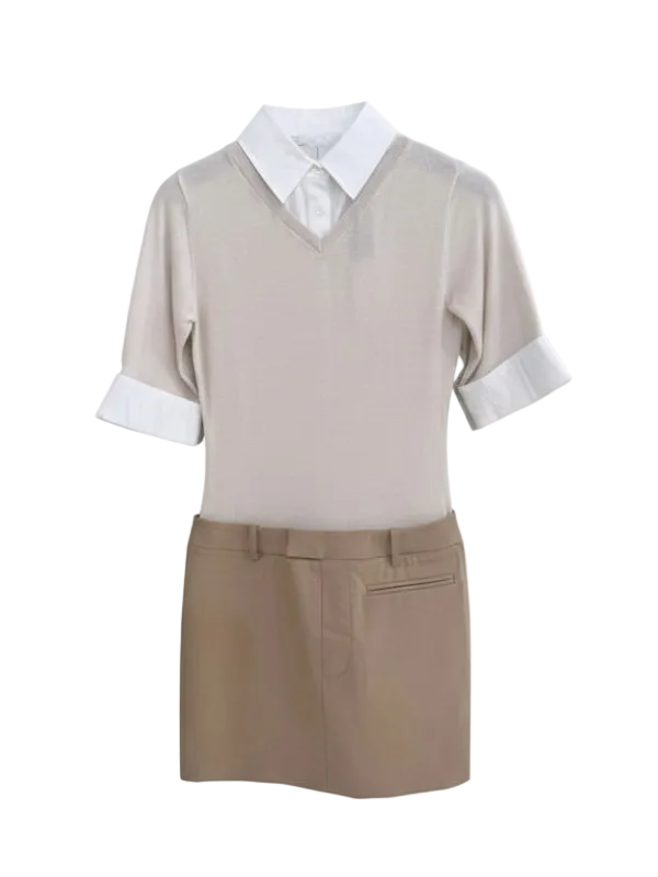 Staud's Geo Mini Dress is a mini dress that looks like separates, featuring a fine merino wool knit bodice with cotton collar and shirt sleeves and a trouser style skirt.
