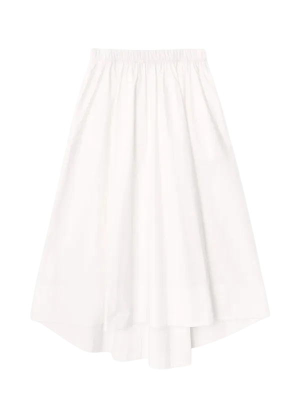 Xirena's Gwynn is back this season in their crisp paper poplin with a refined feel. This pleated pull-on skirt features an elasticized waist, side seam pockets, and a high-low hem.