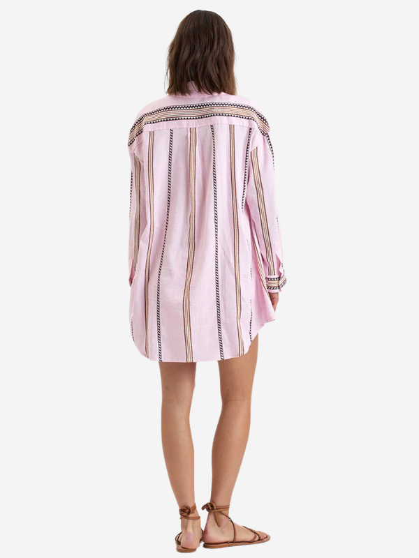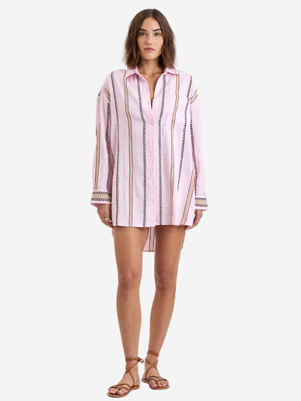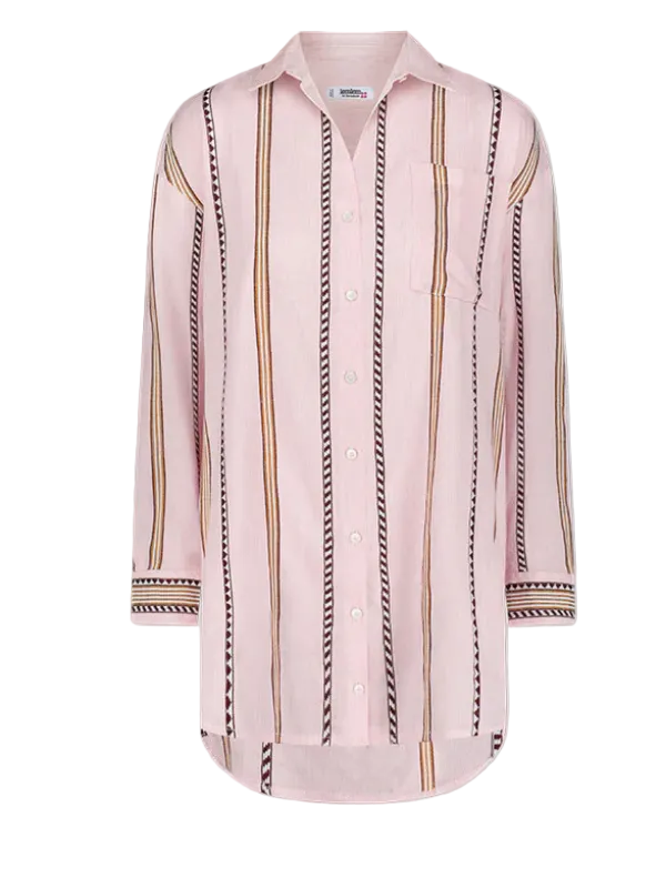 The Mariam shirt dress by LemLem features an oversized, relaxed silhouette, side pockets, a back yoke, a curved shirttail hem, and sustainably sourced and produced natural shell buttons. It can be worn as a swim cover-up, a shirt, or a short dress. Hand-woven in Ethiopia, this silhouette is made of soft hand-spun cotton for a light and comfortable feel.