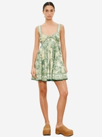 Side view of the Sara Mini Twist Sundress in Green by Alemais, displaying the lightweight fabric and flowy fit, ideal for casual wear.