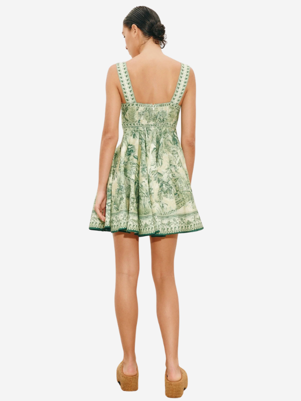 Back view of the Sara Mini Twist Sundress in Green by Alemais, highlighting the shirred panels and elegant cut, perfect for summer outings.