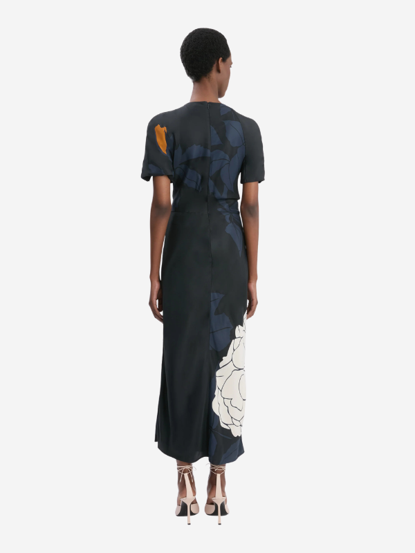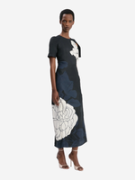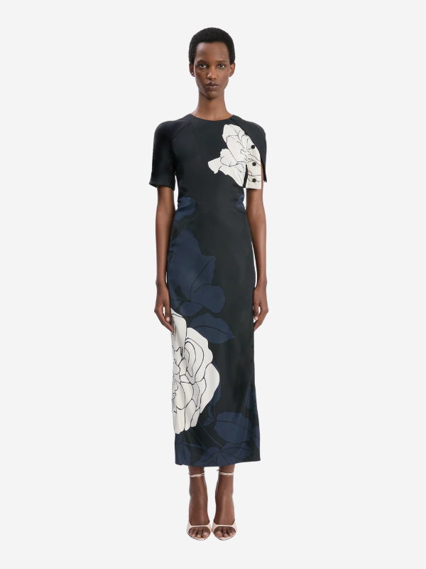 Close-up of the Split Hem Midi Dress by Victoria Beckham highlighting the delicate Pale Rose print on Dark Navy fabric.