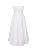 The Wylie maxi dress by Staud is crafted in a classic cotton poplin fabric. This style features a corset-style panel construction as seen in the Wells Dress, spaghetti straps and a straight neckline.