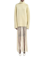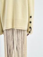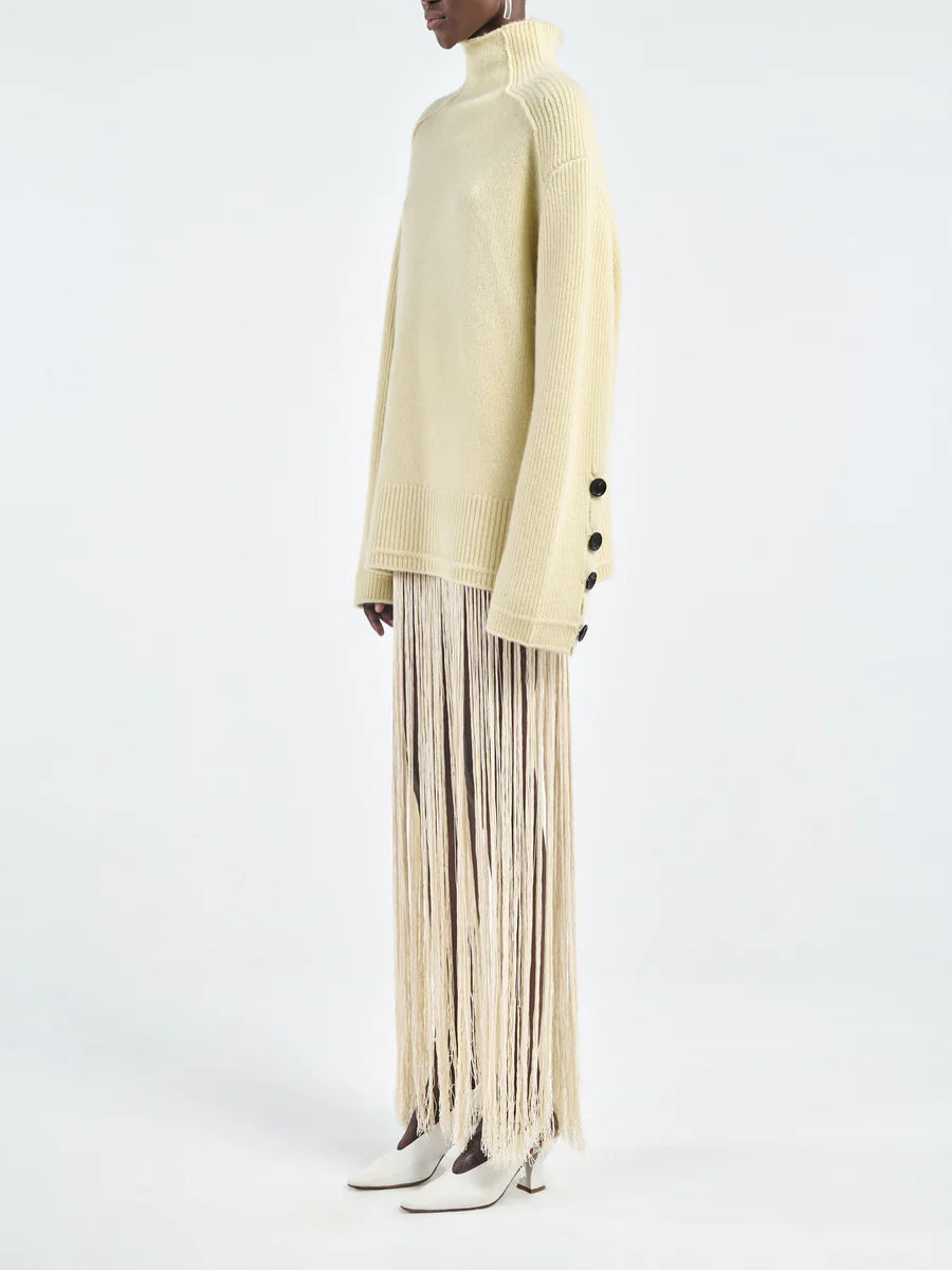 The Primrose Yellow Mock Neck Sweater by Maria McManus is made in a beautifully soft cashmere-wool blend. It is designed with a rib sleeve and jersey body, and has a relaxed, easy fit with 3 large signature corozo nut buttons at the cuff.