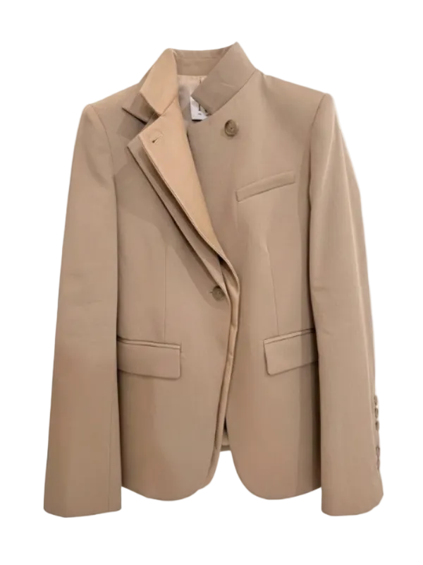The Double Take Blazer in British Khaki/Kelp displayed on a hanger, showcasing its chic silhouette and custom-molded shoulder pads.