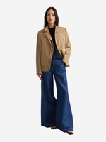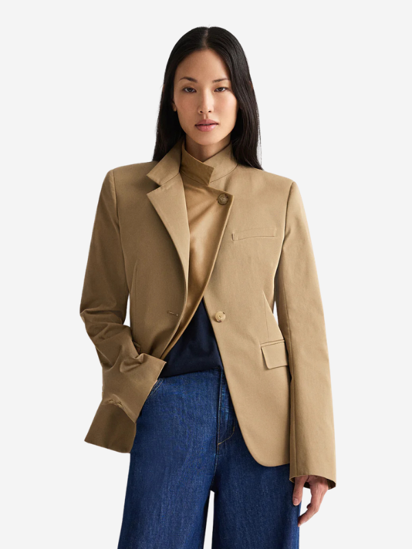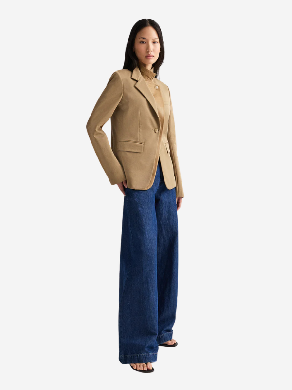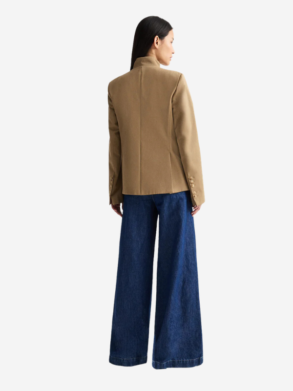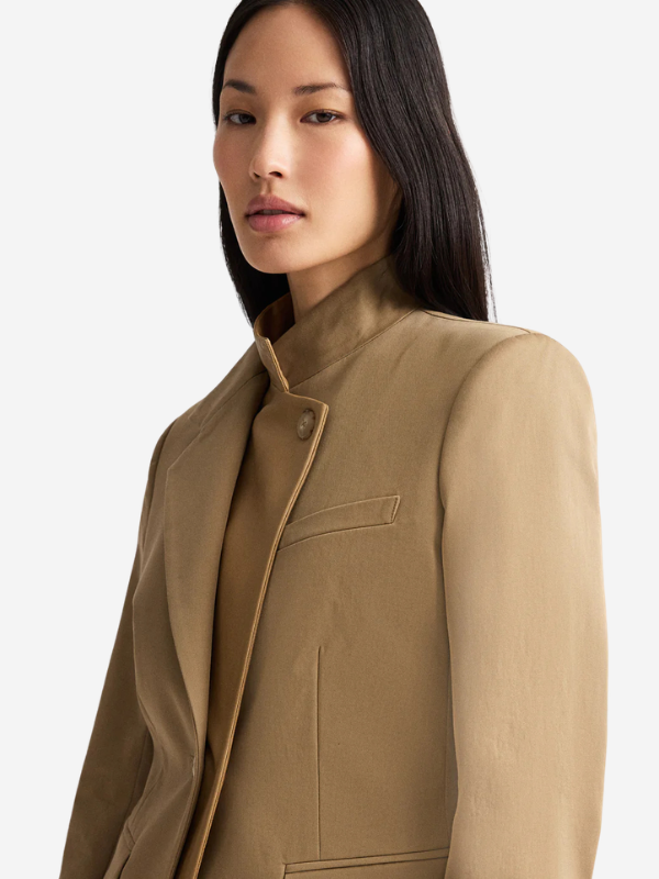 Close-up of the fabric texture of the Double Take Blazer in British Khaki/Kelp, featuring plush cotton twill and stylish stitched detailing.