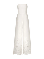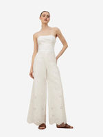 Detailed view of Escapes Jumpsuit in Off White, highlighting the intricate embroidery inspired by Mediterranean elegance.