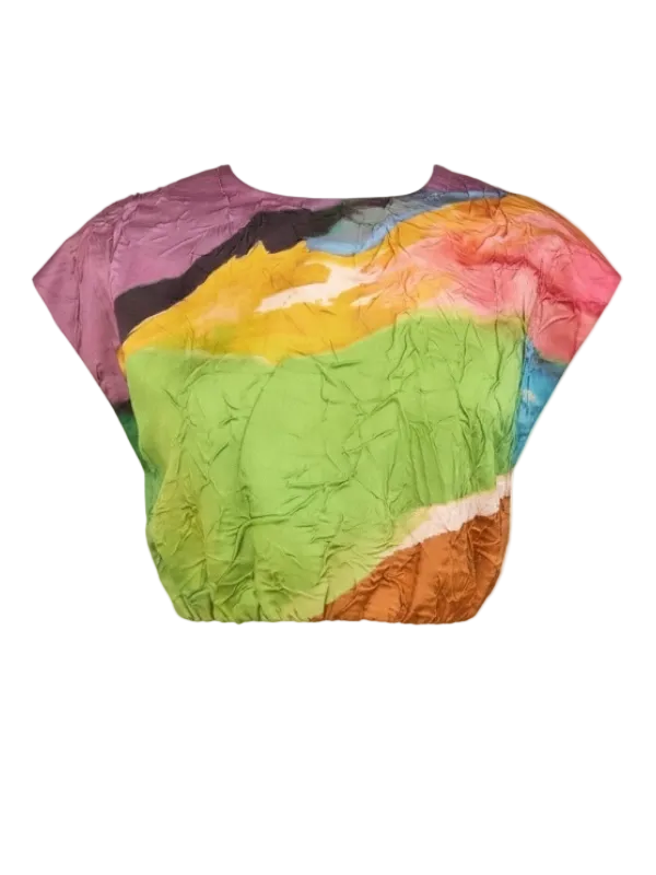 Featured on Ulla for the SS26 Runway finale, the Gisella Top is crafted from Italian satin with heat-pressed crinkles that evoke a painter’s canvas, heightening the depth and dimension of Helen Frankenthaler’s 1973 painting, “Nature Abhors a Vacuum.” This multicolored top is gathered at the hem that creates soft structure and wears with gentle volume.