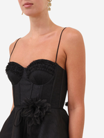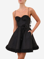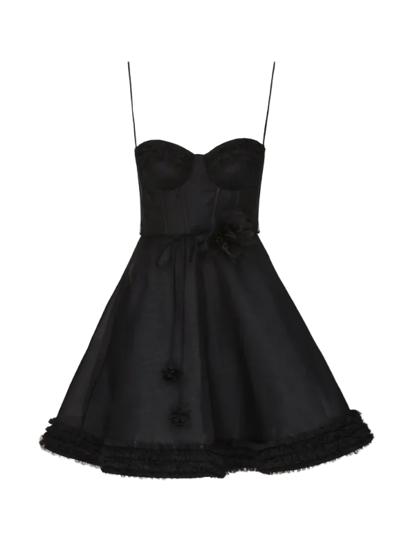 Close-up view of the Luna Ruffle Mini Dress in Black, highlighting the silk-linen blend fabric and rouleau self-tie straps.