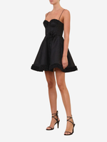 The Luna Ruffle Mini Dress from Zimmermann's Spring 2026 Collection, Kindred Spirit. A silk-linen blend mini dress featuring a sweetheart neckline, fitted bodice, rouleau self-tie straps, finished with a full flare skirt and soft fluff trim.
