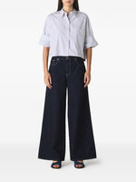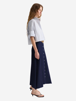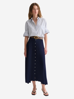 Next Ex Shirt in White/Midnight by TWP, showcasing its stylish spread collar and signature double roll button cuffs, perfect for a casual yet chic look.