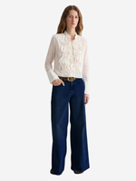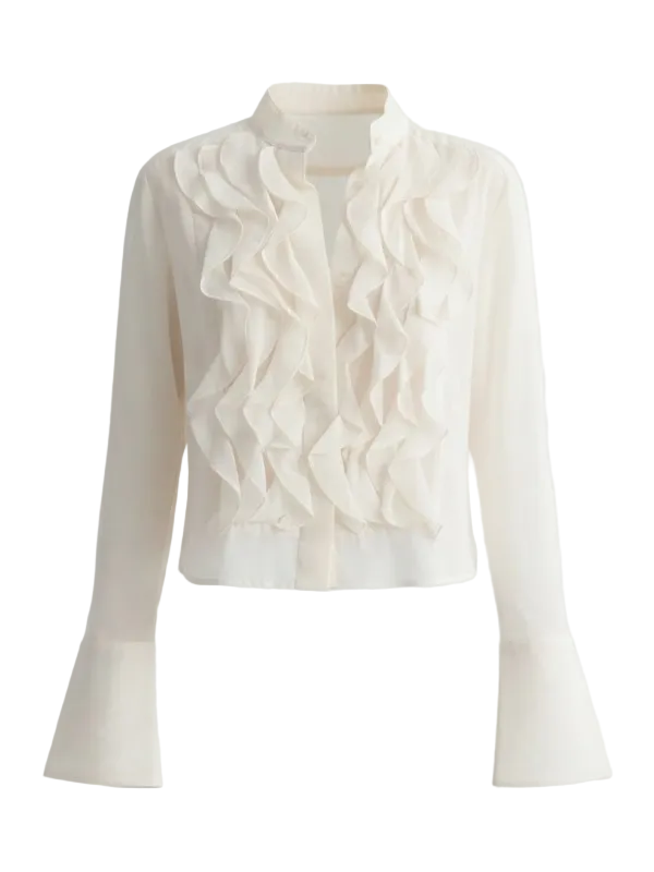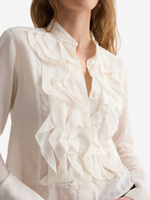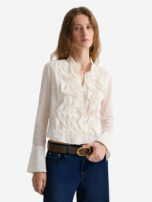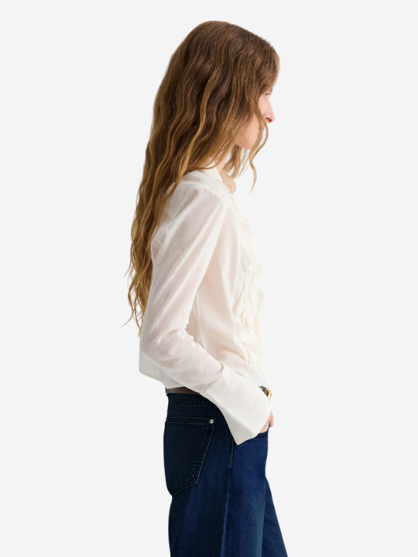 TWP's Patti is a cropped blouse with a neck tie in cotton silk organza. The Patti is slightly fitted at the bust with a playful ruffled bib, a concealed button placket, and long single-button cuffs.
