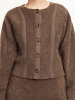 Close-up view of the Pernille Cardigan in Chocolate Chip, highlighting its button closure and plush texture.