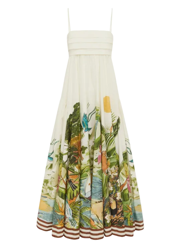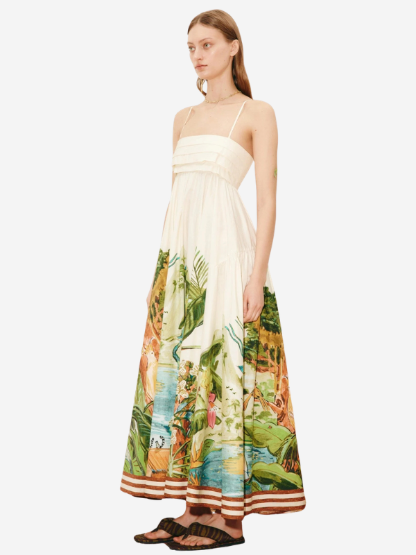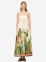 The Toucan Tango Midi dress by Alémais is a midi sundress silhouette featuring a pleated bandeau bust, adjustable straps, shirred panel and a invisible zipper in the back center for comfort.