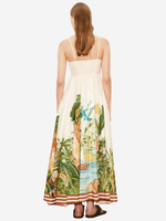 Model wearing the Toucan Tango Midi Dress in Multi by Alemais, showcasing adjustable straps and a stunning tropical design.